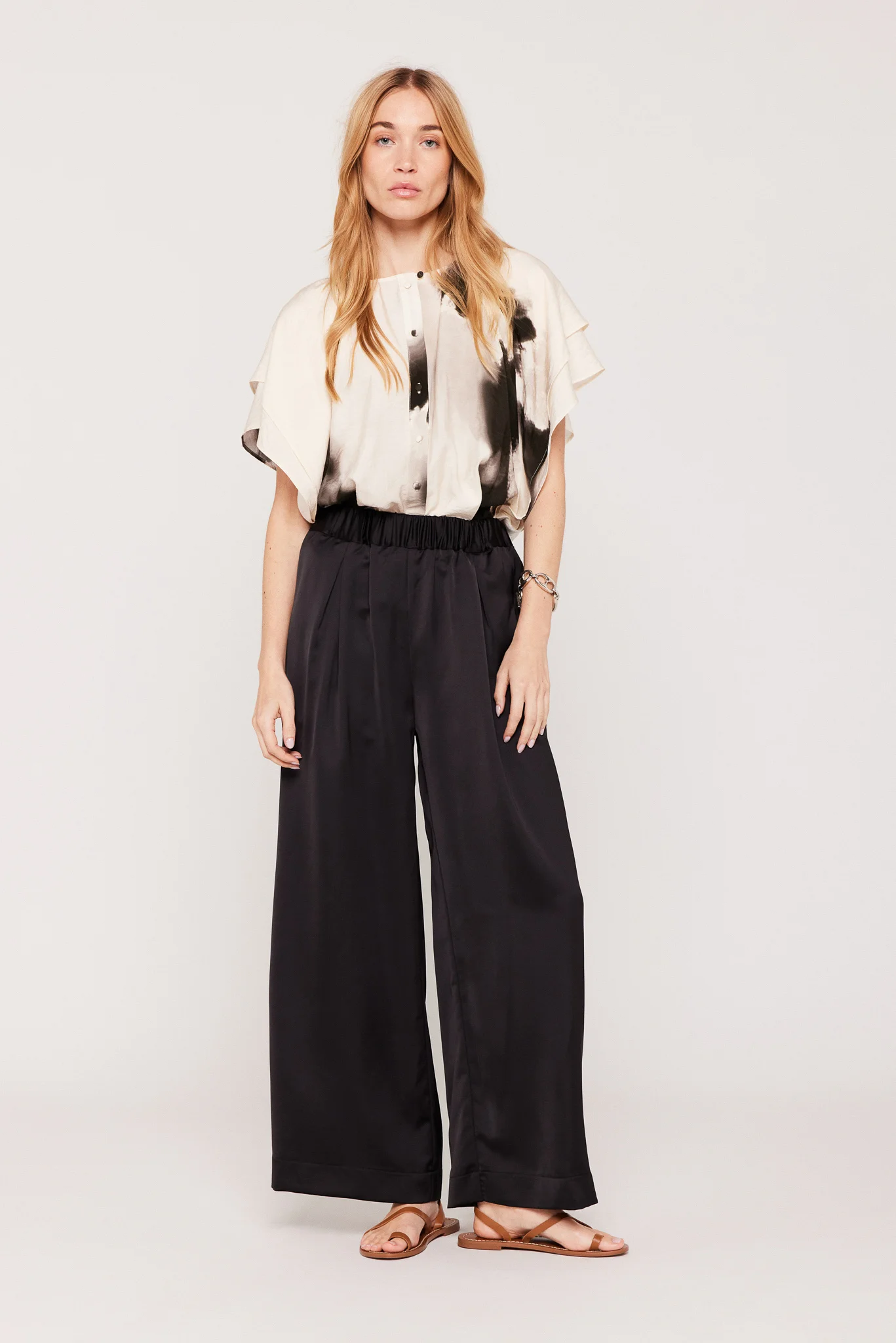 Satin trousers with a wide, fluid cut.