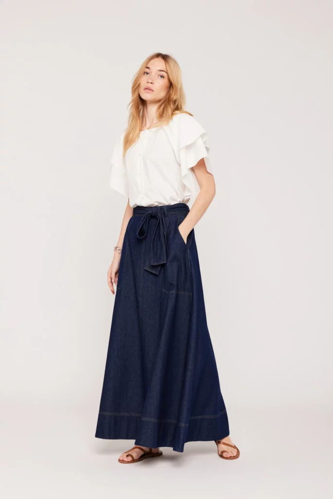 The waist is emphasised by a tie belt, while contrast stitching gives subtle structure to the line.