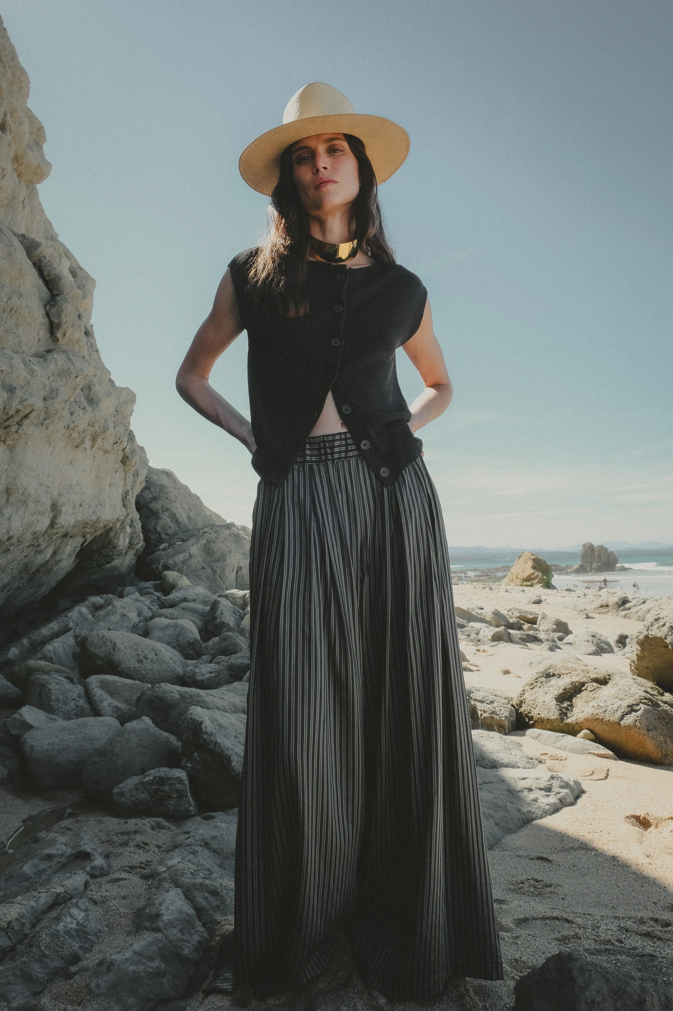 Fluid striped trousers, soft and light, for skin-friendly wear.