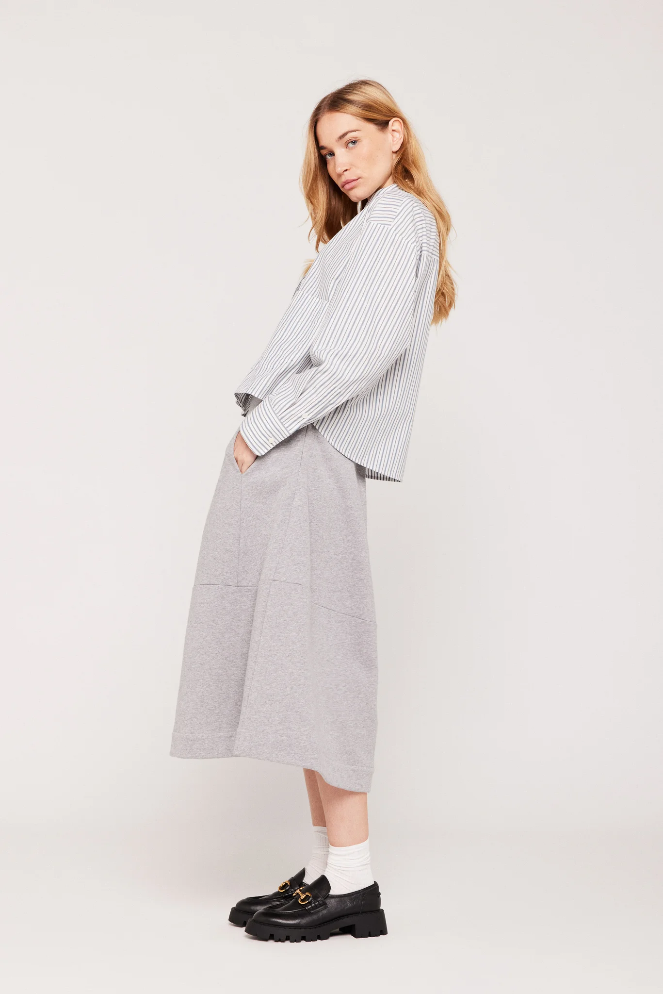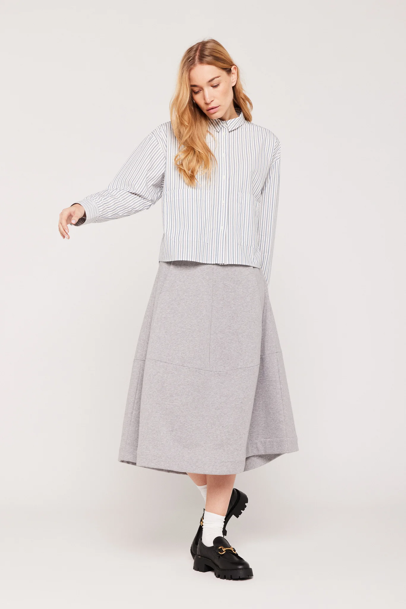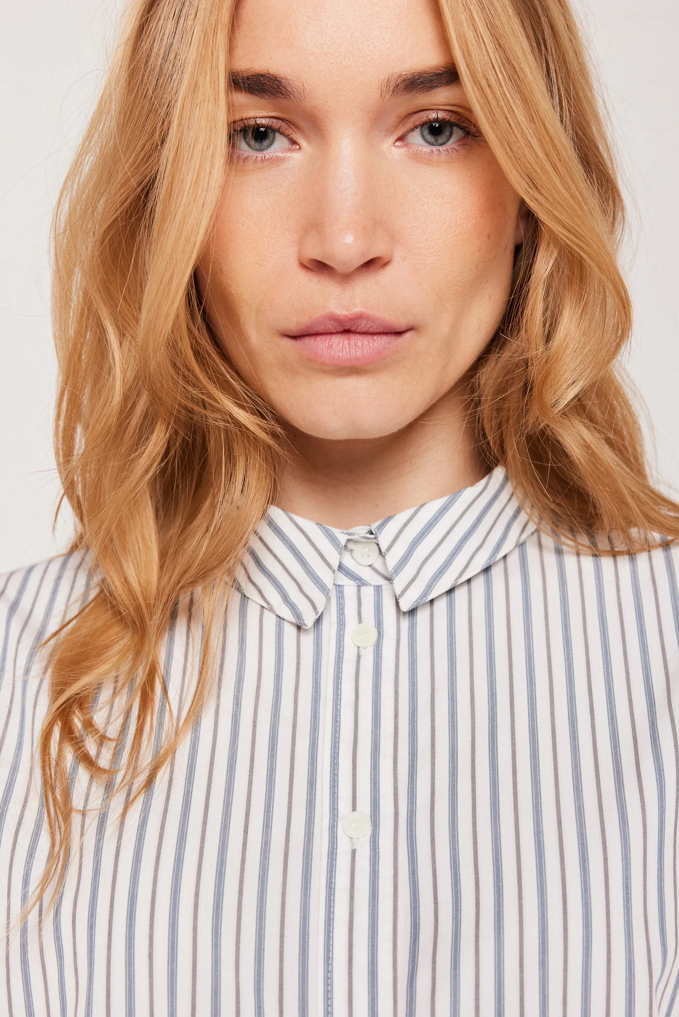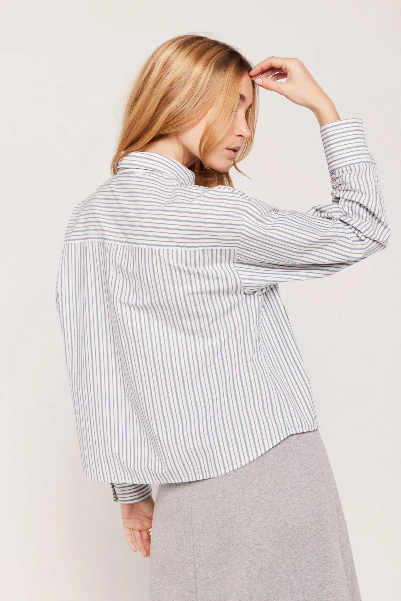 Chemise à rayures fines à la coupe courte droite et légèrement ample.