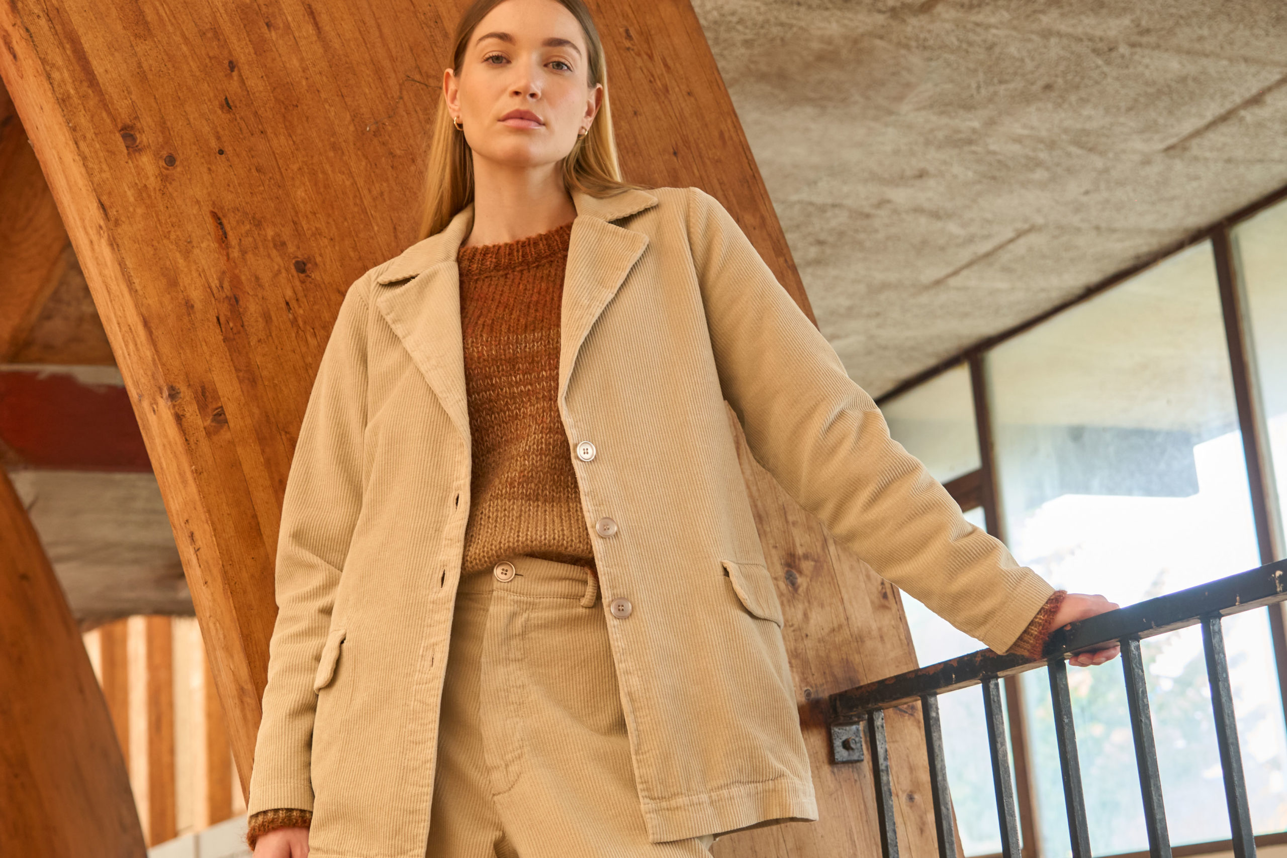 GEMMA est un veste longue en Velours côtelé. Le col tailleur, les trois boutons et les poches à rabat ajoutent à son volume droit en masculin. A porter en total look avec le pantalon GALA assorti pour un total look monochrome.